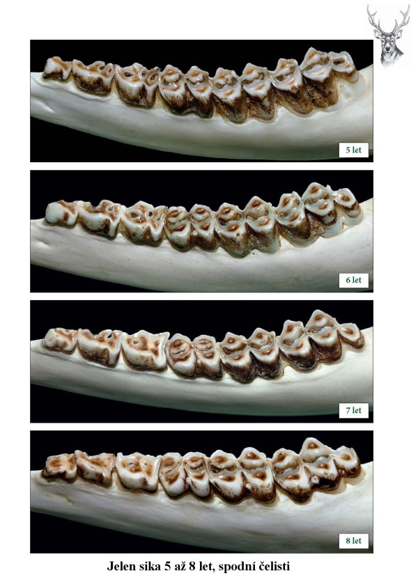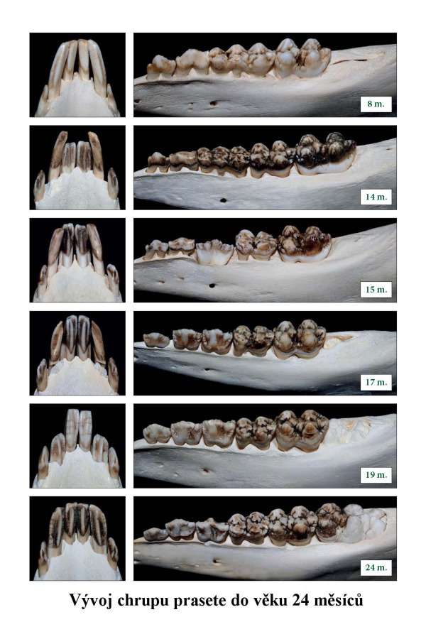 Kapitola věnovaná praseti divokému obsahuje krom vzorové sestavy čelistí dospělých kusů též snímky zvěře mladé (do 24 měsíců).